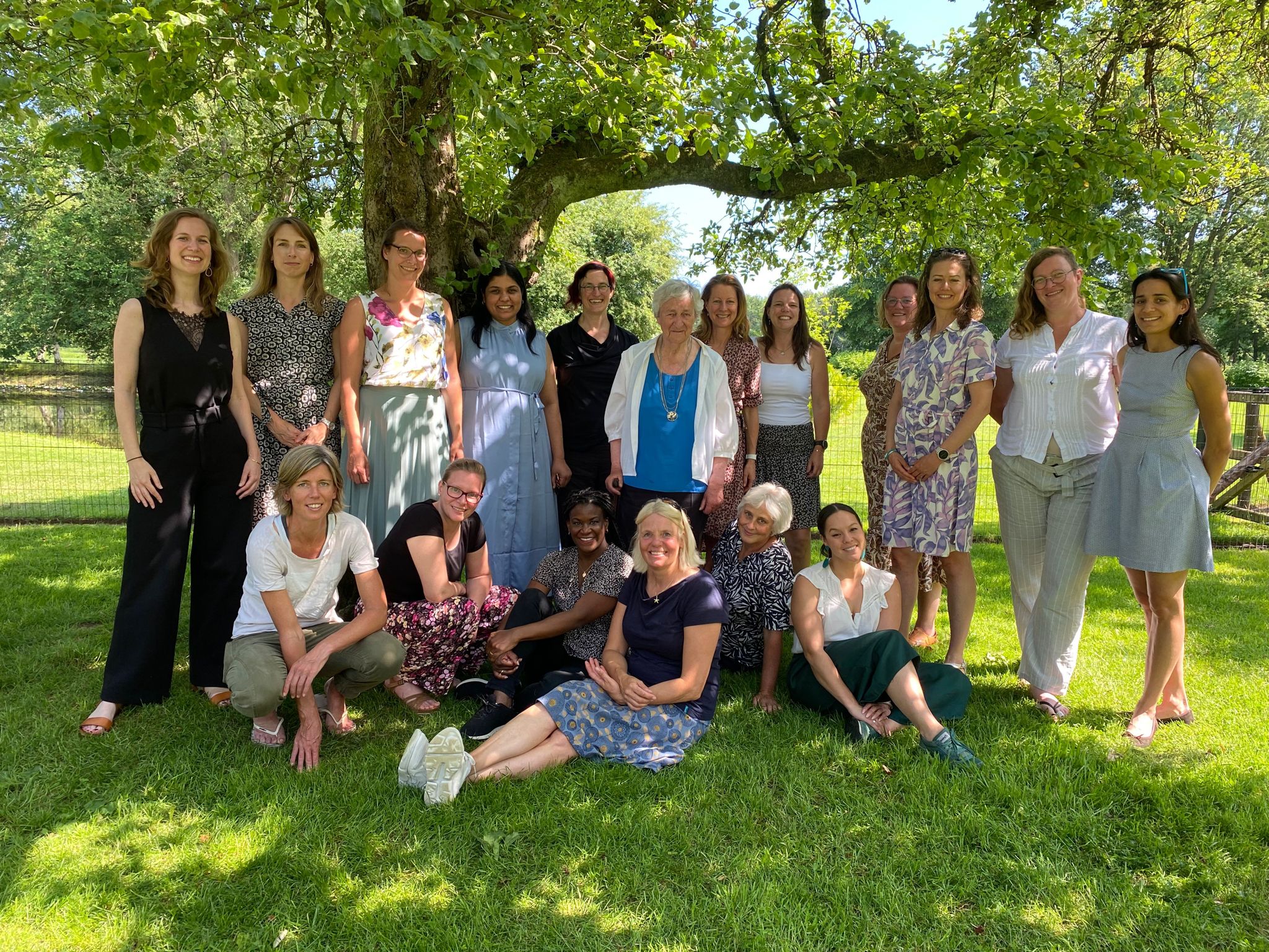 Leden van het Marina van Damme Netwerk waren afgelopen zaterdag uitgenodigd bij mevrouw van Damme thuis. Het was een prachtige dag met stralend weer en zomerse temperaturen, perfect om te genieten van de schaduw van de Groningse Kroon appelbomen.